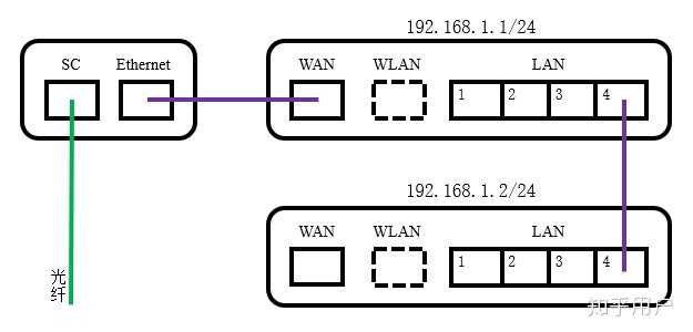 在这种情况下,两个路由器的LAN端口通过双绞线互连,并合并到同一LAN区域中. 任何LAN端口之间的通信不需要LAN端口IP地址的参与. 两台路由器的LAN端口的IP地址分别为192.168.1.1和192.168.1.2,前缀长度为24位,属于同一逻辑网段(三层网段). 直接连接到光调制解调器的设备的LAN端口(光猫)IP地址用作所有终端的默认网关,也用作Web管理地址(输入192.168.1.1/进入设备1的管理接口);第二个设备的LAN端口IP地址仅用作Web管理地址(输入192.168.1.2/可以进入设备2的管理界面),不承担数据转发的功能.