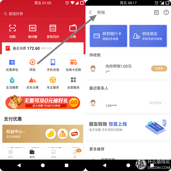 ▼JD Finance没有社交功能,转账位于付款页面上. 默认情况下,它仅支持转账至. 但是,对于某些用户,已激活了转给朋友的功能,并且仅通过输入对方的手机号码就可以将钱转移到对方的京东财务. 收件人可以在确认后指定收款,这非常亲密.