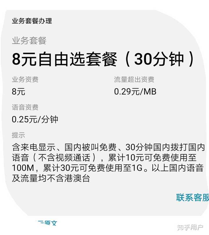 客户服务: 8元免费选择套餐包括两个套餐. 您选择呼叫30分钟还是100M数据?