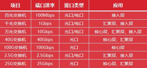 “根据端口速度,它可以分为100M交换机,千兆交换机,10G交换机和更高速度的交换机. 100M和千兆交换机主要用于访问层; 10G和更高速率的交换机用于汇聚层大型网络和小型网络的核心层. ”