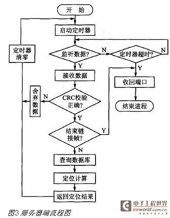 服务器端首先需要不断指定端口,当到客户端的请求时,创建新进程,该进程负责处理客户端的请求,其处理过程如图3所示。数据,如果接收到该数据,则进行CRC校验并结束链接帧,根据请求内容查询并进行定位运算,最后返回定位结果,通过数据传输反馈给客户端界面显示定位信息。