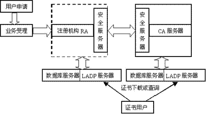 一个典型的CA系统包括安全服务器、注册机构RA、CA服务器、LDAP目录服务器和服务器等。如图2所示。