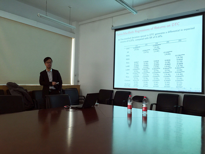 本次研讨会由香港科技大学金融系博士生李伟凯就“空头回补天数和股票收益”为题做了精彩的报告。报告探讨了拥挤交易和卖空背景下的流动性之间的关系,用空头的回补天数DTC作为评判拥挤交易的指标,用日成交量和每日报价价差百分比等五个变量作为流动性的指标。报告认为套利者会减少流动性较差的股票的仓位,并从拥挤交易的仓位获得补偿。同时本报告也研究了拥挤交易对对冲基金持有量的影响,认为高仓位的对冲基金表。在报告过程中,老师和同学们提出了多个疑问,李伟凯博士都给出了详细而具有说服力的解释,并与参会人员进行热烈的探讨和交流,使得在场的人员都因本次浓厚的学术氛围而受益良多。