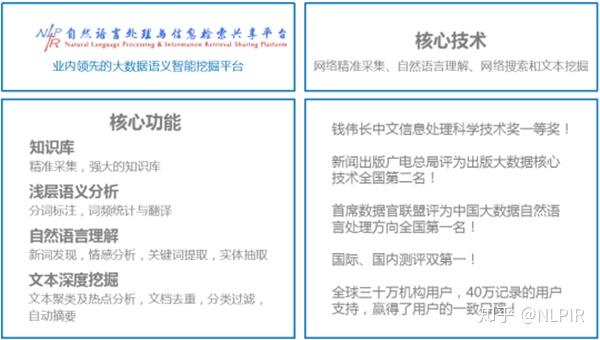 NLPIR大数据语义智能分析平台(以前称为ICTCLAS)是由北京理工大学大数据搜索与挖掘实验室主任张华平开发的. 为了满足大数据内容编辑,编辑和搜索的综合需求,它集成了网络准确收集,自然语言理解的功能. 文本挖掘和语义搜索的最新研究成果近二十年来一直在不断创新. 该平台提供了多种产品使用形式,例如客户端工具,云服务和二次开发接口. 每个中间件API都可以无缝集成到客户的各种复杂应用系统中,与Windows,Linux,Android,Maemo5,FreeBSD等不同的操作系统平台兼容,并且可以用于Java,Python,C等各种开发,C#语言使用.