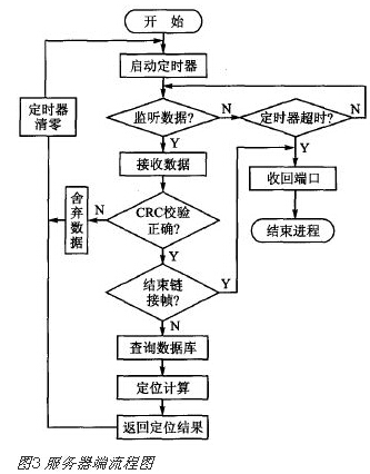 服务器端首先需要不断指定端口,当到客户端的请求时,创建新进程,该进程负责处理客户端的请求,其处理过程如图3所示。数据,如果接收到该数据,则进行CRC校验并结束链接帧,根据请求内容查询并进行定位运算,最后返回定位结果,通过数据传输反馈给客户端界面显示定位信息。