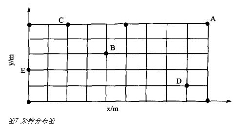 实验区域为10 m×16 m,每隔1.5 m设定为一个采样点,AP分布在该区域的四周如图7黑色圆点位置,每个采样点分别采集200次经过平滑处理后存入离线。为比较定位结果的精确性,选定如下5个点为测试点:A位于出口处附近,B位于区域的中心位置,C、D、E点位于区域的边界处。