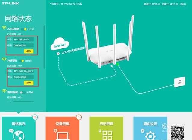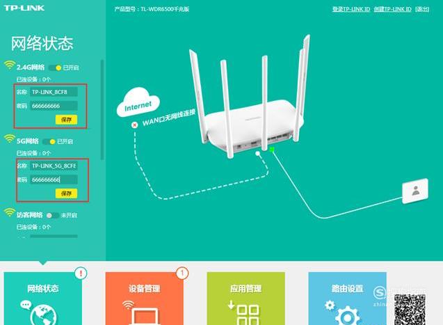 单击网络状态----->设置无线名称和无线密码----->单击保存.