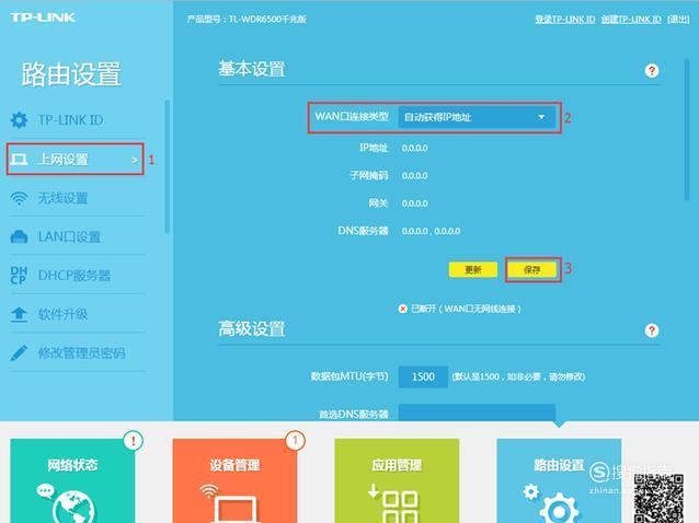 通过单击“路由设置” ----->“ Internet设置” ----->更改WAN端口连接类型以自动获取IP地址----->“保存”.