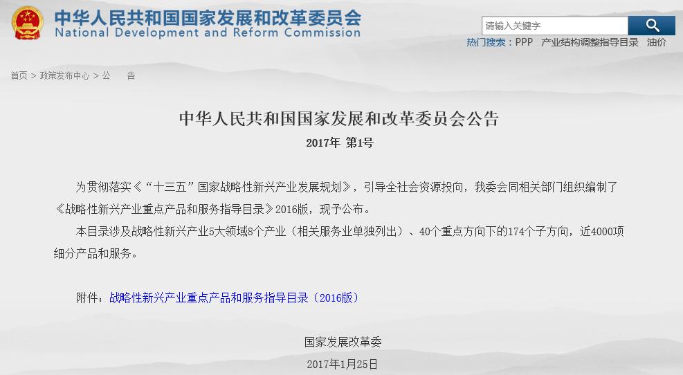 通信世界新闻(CWW)日前,中华人民共和国国家发展和改革委员会发布通知,称其目的是实施“国家战略性新兴产业发展“十三五”规划”,并进行指导. 在社会资源投资方面,国家发展和改革委员会是相关部门. 该部门组织了2016年版的《战略新兴产业关键产品和服务指导目录》(以下简称目录). 据报道,该目录涉及战略性新兴产业(分别列出相关服务产业)的5个主要领域的8个产业,40个主要方向下的174个子方向,近4000个细分产品和服务.