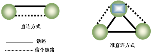 a)直联方式:两个信令点之间通过直达信令链路传递消息。此时,话路和信令链路是平行的。(STP之间采用)