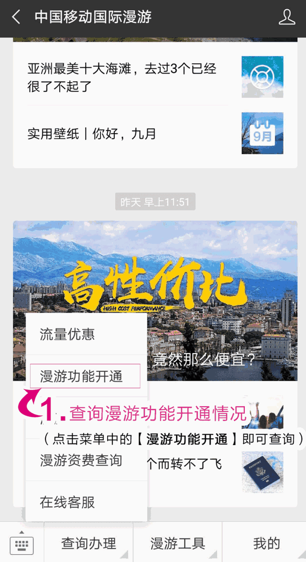 除提供漫游服务外,公共帐户还将偶尔推送海外信息和海外旅行指南. 那些需要它的人可以订阅知道.
