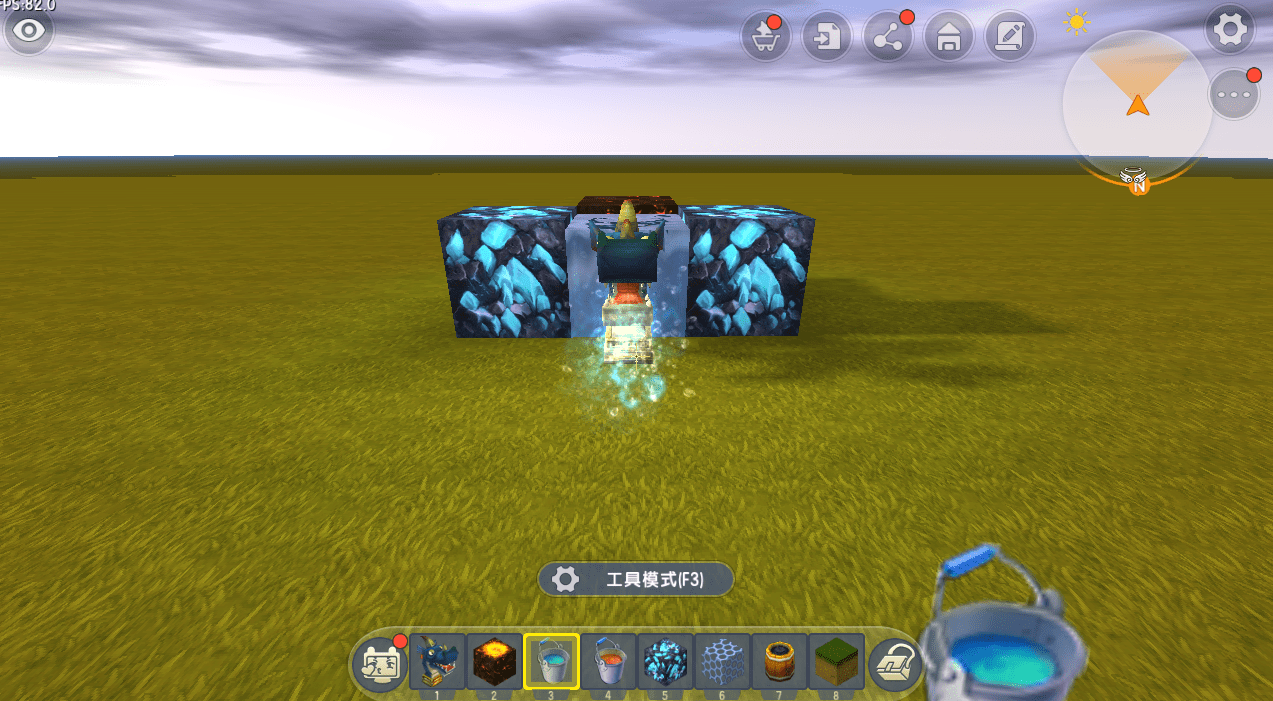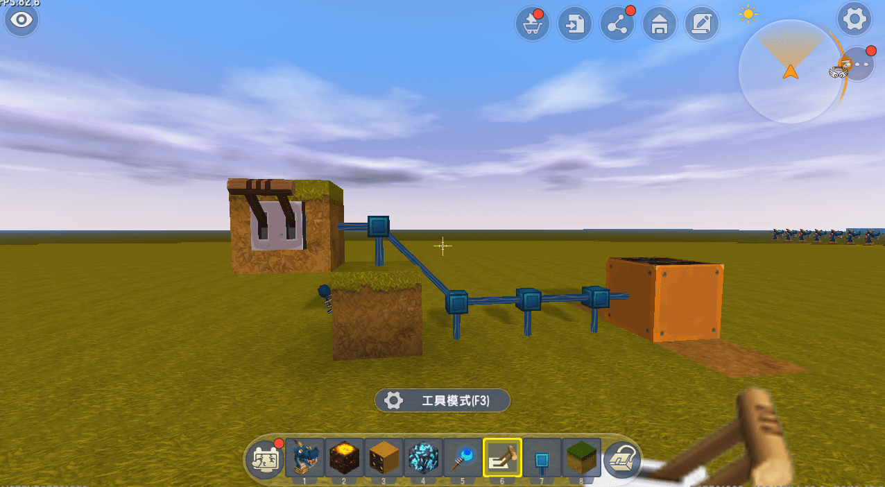 黑龙雕像喷出气泡. 再也无法用硫磺结晶砂解决它. 它还需要一台产生气泡的机器来制作这样的场景. 因此,第一步是创建一个具有向上方向的发射装置,以及一个在地面上具有任何发射端口的发射装置. 连接任意一侧的蓝色电源线,至少延伸三个地面距离,然后取出普通的方块,以创建梯形方块结构.