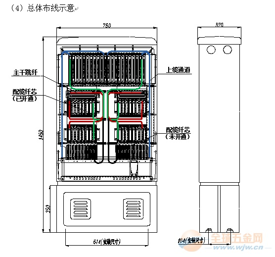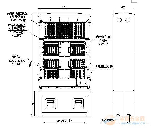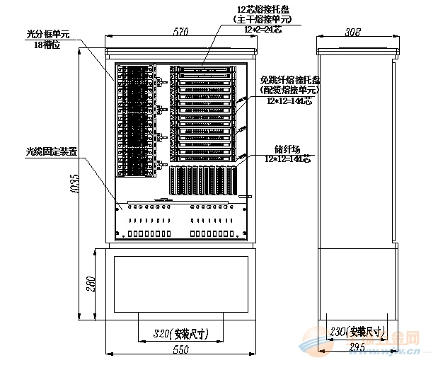 ◇ 机架顶部、底部均开有进缆孔。144芯光纤交接箱光缆固定、开剥装置可灵活安装,既可满足上走缆方式要求,又可满足下走缆方式要求;