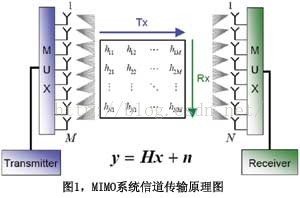 MIMO(Multiple-InputMultiple-Output)技术是针对多径无线信道来说的,它是指在发射端和接收端分别使用多个发射天线和接收天线,它与传统的信号处理方式的不同之处在于其同时从时间和空间两个方面研究信号的处理问题,从而能够在不增加带宽与发射功率的前提下,提高系统的数据速率、减少误比特率、改善无线信号的传送质量。它的原理如下图所示: