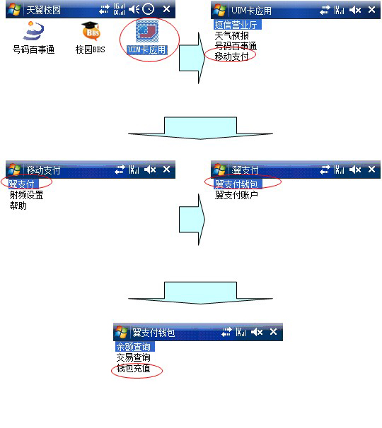 可以使用手机菜单"UIM卡应用"从翼支付帐户向翼支付钱包圈存资金,按菜单提示完成充值。