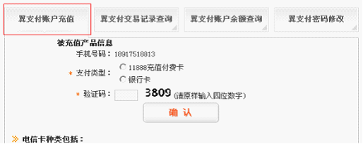 发送短信内容(仅限电信11888充值付费卡)"CZYZF#充值付费卡密码"到10001向翼支付账户充值功能
