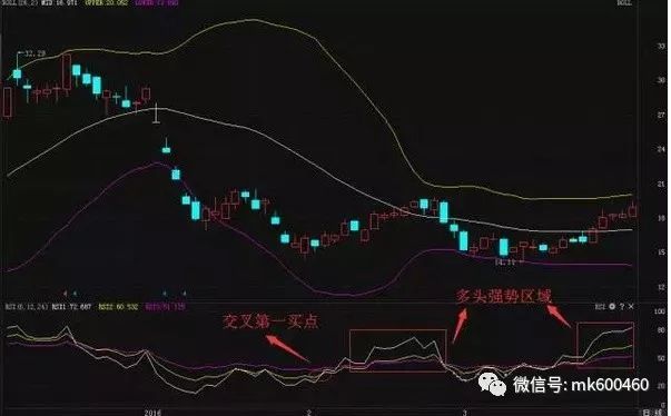 RSI指标通常由三个周期不同的RSI线组成,分为短,中和长RSI线. 当短期,中期和长期RSI低于20,并且短期RSI超过中期RSI时,这是第一个买入点. 中长期RSI处于多头位置并且超过50,这是一个强大的多头区域,如下图所示: