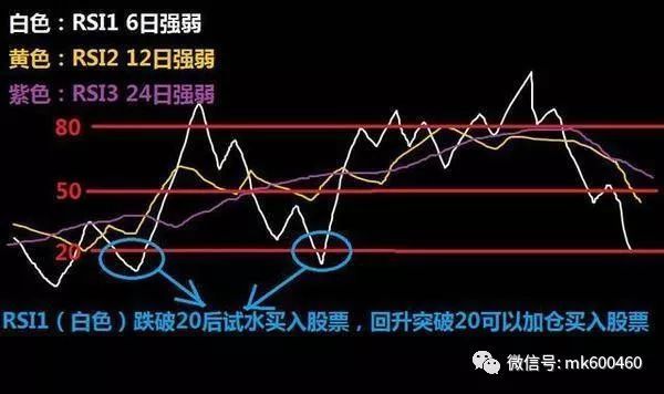 当RSI白线跌至20以下时,表明股市已进入超卖区域. 通常,此时股价几乎没有继续下跌的空间. 可以暂时建立头寸,股价反弹,RSI当白线再次突破20时,选择增加头寸. 但是,毕竟这是一个超反弹的反弹,迅速进入和退出市场.