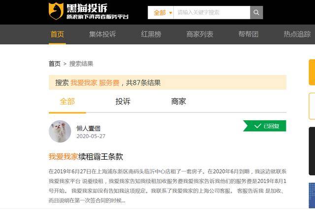 例如,6月19日标题为“我爱我的家人强制性”的“黑猫投诉”消息显示: “ 2019年7月与我爱的家人签署了为期一年的租赁合同,已支付佣金,并在现在每个月都有时间,合同即将到期,我想直接续签,但是我爱我的中介机构,通知我额外的收入,没有理由,只是说公司规定不续签“在不支付的情况下支付. 续签的在合同签订时尚未通知,并且该国没有相关规定. 强制性费用无法达成协议. ”实际上,只有“黑猫投诉”搜索关键字“我爱我的家庭”,并且有87条投诉消息.