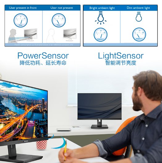 此外,此显示器还具有智能节电功能,可以减少能耗. PowerSensor的动态光感应技术可以智能地感应用户的工作状态. 当我们离开座位时,它将自动降低屏幕亮度或停止屏幕. 不仅可以保护工作隐私,还可以打开省电模式; LightSensor环境光感应功能可以根据室内照明条件自动调节屏幕亮度,从而节省电力,使视觉更加舒适.
