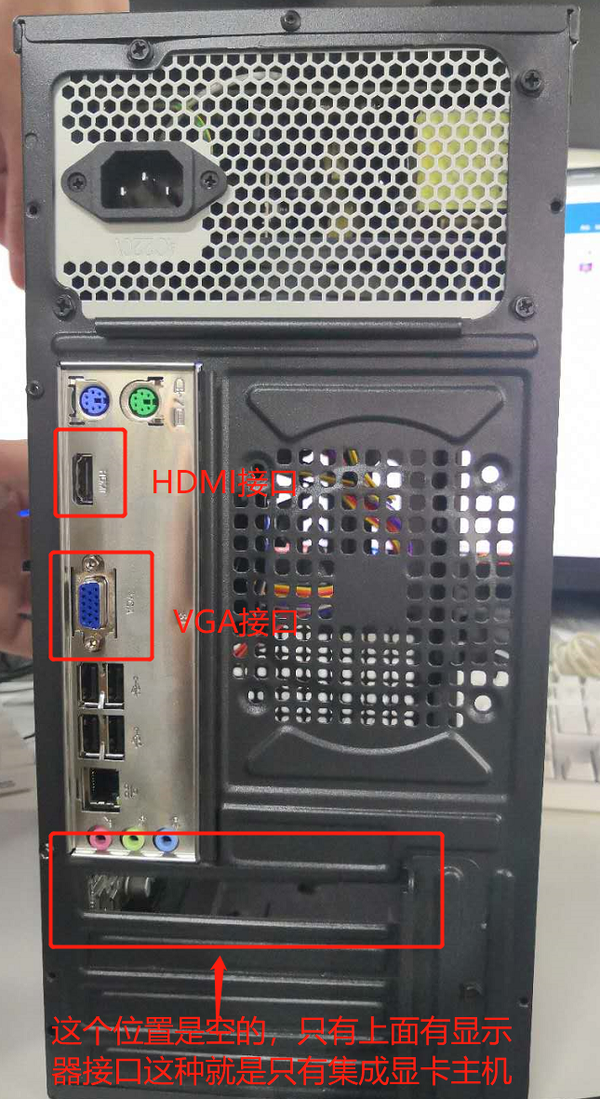请注意这种接线. 对于带有独立显卡的主机,视频电缆必须连接至独立显卡;如果确定没有独立显卡,则将其连接到主板的集成图形显示接口