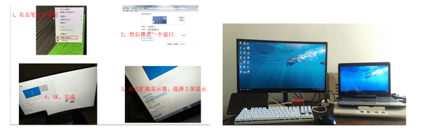 右键单击笔记本电脑系统界面的空白区域-屏幕分辨率-扩展显示-选择2个屏幕-单击应用-确认,就是这样.