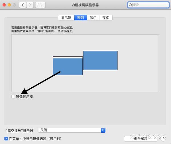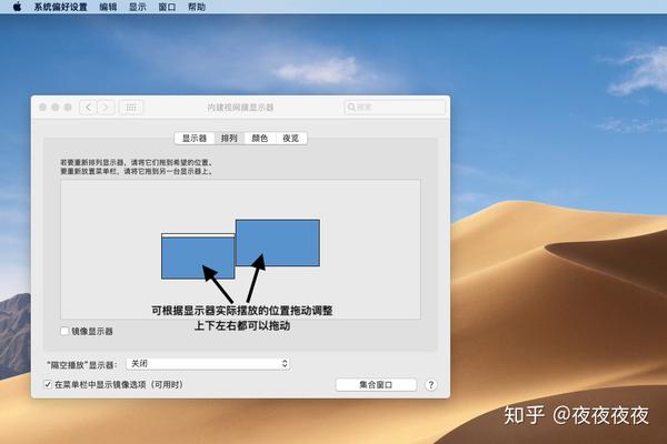 在连接显示器和Mac之后,根据显示器的物理空间调整布局,即可正常使用. 显示排列设置路径: 单击左上角>“系统偏好设置”>“显示”>“排列”>拖动显示图标进行调整