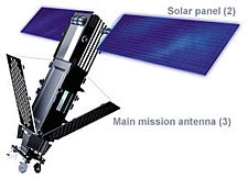 [图片说明]当按原计划在轨道上展开之后,铱星的轴线会指向地球中心,三块镀银的主任务天线也会向外展开,传送信号——或者偶尔反射一下阳光。图中的第三块天线在卫星的后面。承蒙Donald Baker提供照片。