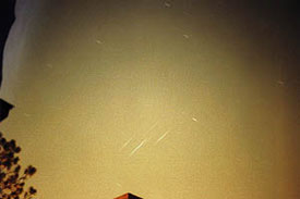 [图片说明]1997年8月26日Paul Maley在休斯敦拍摄到了穿过鲸鱼座最南端的5颗铱星(从左到右依次为铱星22-26号)。在世界时11:02,Maley曝光90秒拍摄了这张照片。在发射升空后不久,卫星会占据同一轨道面的不同位置。铱星