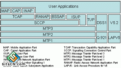 图中MAP,CAP,RANAP,BSSAP为移动通信系统使用的信令;ISUP,TUP,INAP为固定网使用的信令;DSS1和V5.2为接入网使用的信令。