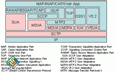 图中粉红色部分为SIGTRAN的协议栈,在它们之上的是对应的电话信令协议。SIGTRAN的协议栈分为2层:一层是SCTP,它提供多个流的,可靠的数据传输,用户数据的捆绑和分段,阻塞和流量控制,防止“拒绝服务”和“伪装”的攻击等功能。另一层是用户适配层,图中由SUA、M3UA、M2UA、M2PA、IUA和V5UA五个适配模块所组成,它们分别来满足各种电话信令协议适配的要求。
