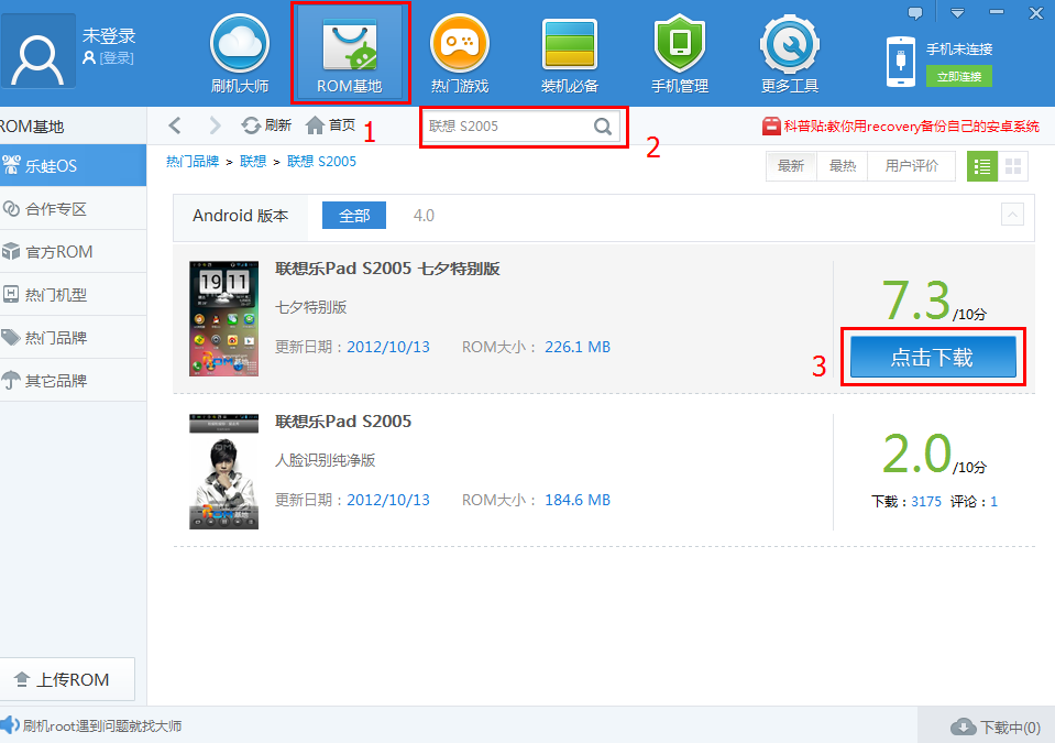 选择联想S2005的刷机包或者是点击刷机大师里面的ROM基地,然后在左边点击热门品牌,搜索联想S2005,点击进去就可以见到联想S2005的ROM包。