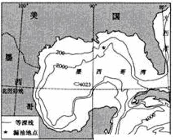 2010年4月20日,位于墨西哥湾的一座海上钻井平台起火,导致约1600米深处漏油,造成严重的海洋污染。由于天气恶劣等原因,虽然有关方面采取多种措施控制污染蔓延,但效果均不好。随即美国南部4州进入紧急状态,并宣布在该海域禁捕。有关专家还担心浮油可能“侵入”,甚王漂向欧洲沿海。图l8为墨西哥湾海域。