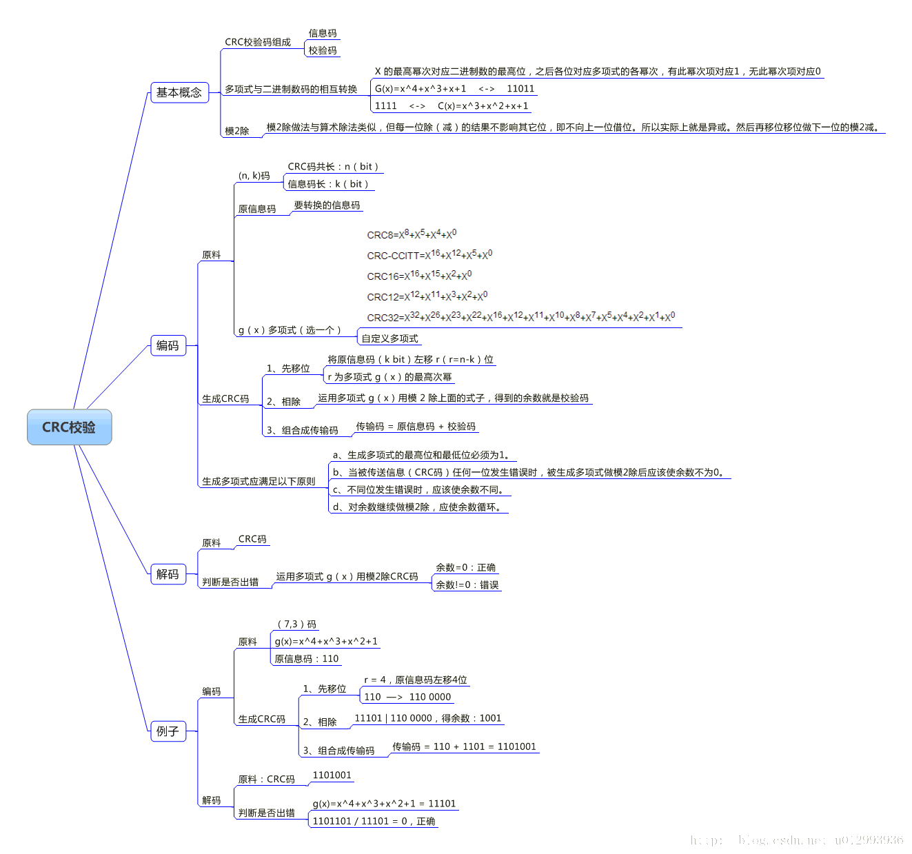 在K位信息码后再拼接R位的校验码,整个编码长度为N位,因此,这种编码又叫(N,K)码。对于一个给定的(N,K)码,可以证明存在一个最高次幂为N-K=R的多项式G(x)。根据G(x)可以生成K位信息的校验码,而G(x)叫做这个CRC码的生成多项式。