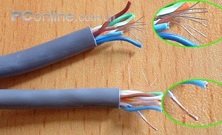 再把网线芯导线的线皮剥掉,看到不一样了吧。普通百兆线是单一根铜丝,而千兆线是每芯里面还有7根镀银线。千兆网线做法明显的,传输效率也就高了,而且在日常的使用中,更不易折断。