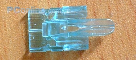 以下是水晶头的特写,这张是正面的,可以清晰的看到LUCENT字样,整体材质为半透明磨砂,手感不错,和百兆水晶头的那种全透明光滑表面不同。在LUCENT 这个logo的位置,原来是百兆网线水晶头的卡线器位置,用来固定后端的网线。这个千兆水晶头改用了另外一种卡线器,在后面的解剖中我会详细介绍。