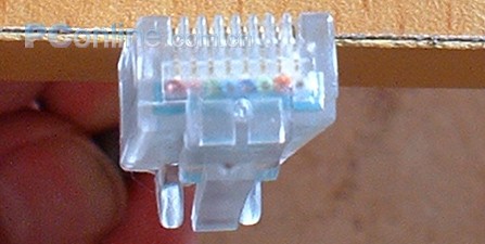 首先,双绞线从分线器的后部穿入,在十字形的导入口就按照线对分开了,白、橙入左孔;浅蓝、深蓝入上孔;浅绿、深绿入下孔;浅棕、深棕入右孔。到前端后按照白、橙、浅绿、深蓝、浅蓝、深绿、浅棕、深棕的顺序被排好,线头与前端对其后就可以插入RJ45水晶头的外壳了。这个是一个不错的改进,一下就把原来那种又掰又捏又捅的别扭工序摒弃了。而且线芯只有到了顶端才变成平面的排列,在整个接头的80%的区域仍然保持着双绞和圆形的状态,这明显比原来的百兆接头强多了。不光是制作工序上,在传输效率上也是比较大的改进。(这么多怪怪的零件,看来原来的RJ45压线钳是对它束手无策了)