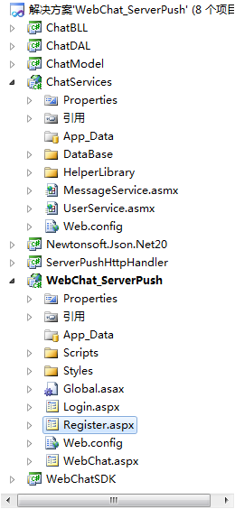 其中(项目网站--WebChat_ServerPush和服务器端处理--ServerPushHttpHandler)需要在Web.config配置文件中做出如下配置: