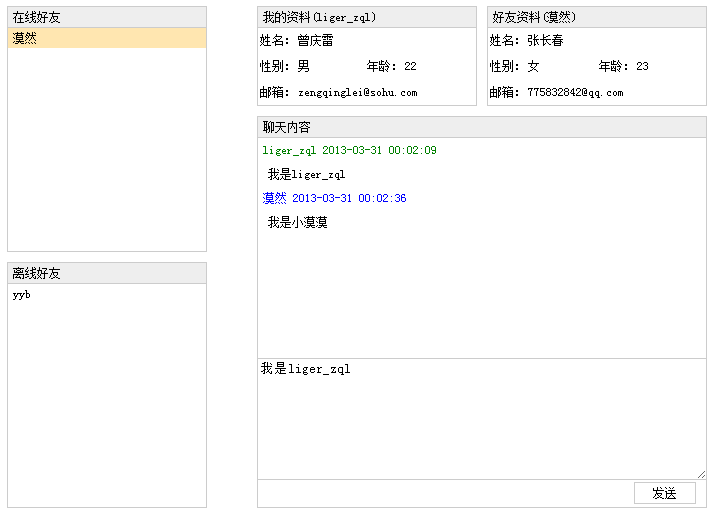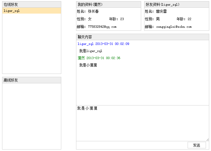 登录成功后,两选项卡分别跳转到如下界面:双击好友中的行,则可开始进行聊天。服务器推送技术服务器推送技术