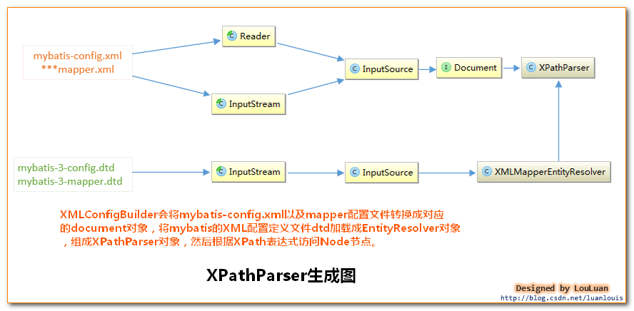 1. XMLConfigBuilder会将XML配置文件的信息转换为Document对象,而XML配置定义文件DTD转换成XMLMapperEntityResolver对象,然后将二者封装到XpathParser对象中,XpathParser的作用是提供根据Xpath表达式获取基本的DOM节点Node信息的操作。如下图所示: