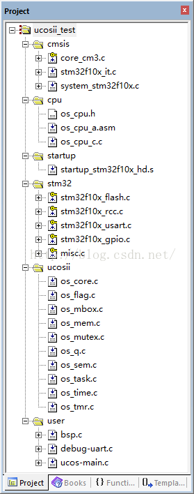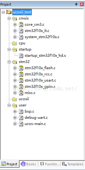 创建好工程之后,需要加入main函数主文件和板级硬件初始化函数的文件,在这里我将已经写好的bsp.c,debug-uart.c,ucos-main.c文件已经加入工程里了,在下面贴出代码: