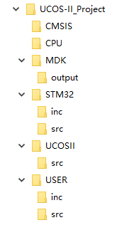 创建UCOS-II_Project工程存放文件的文件夹目录结构,树形结构见(图6)