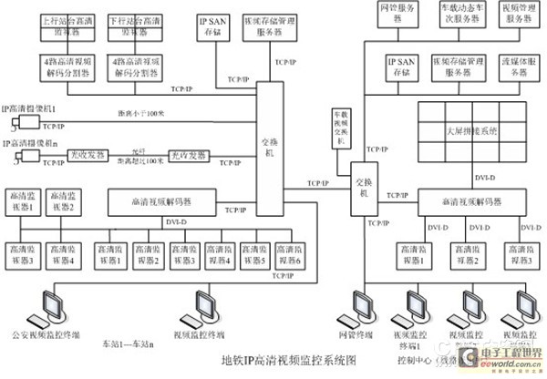 闭路电视监视系统是保证城市轨道交通行车组织和安全的重要手段,调度员和车站值班员利用它监视列车运行、客流情况、变电所设备室设备运行情况,提高行车指挥透明度的辅助通信工具。当车站发生灾情时,闭路电视监视系统可作为防灾调度员指挥抢险的指挥工具。地铁高清视频监控系统构架有IPC(网络摄像机)+ IP SAN存储、HD-SDI高清摄像机+视频编码器+高清视频矩阵+IP SAN存储等模式,每种模式都有其特点,但适合今后地铁运营管理和治安管理的实现比较容易视频监控模式是IPC +IP SAN模式性价比最好,下面将此模式进行探讨。