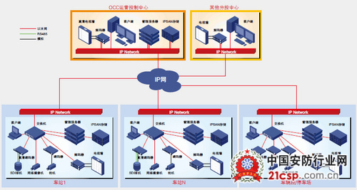 对于单条地铁线路,系统主要由车站/车辆段/停车场监控和OCC运营控制中心组成,形成OCC控制中心和车站/车辆段/停车场本地监控的两级联网监控架构,如下图所示。