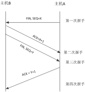 第一次挥手:主机A向主机B发送FIN包;A告诉B,我(A)发送给你(B)的数据大小是N,我发送完毕,请求断开A->B的连接。