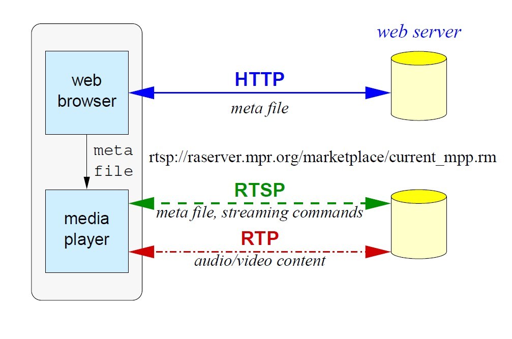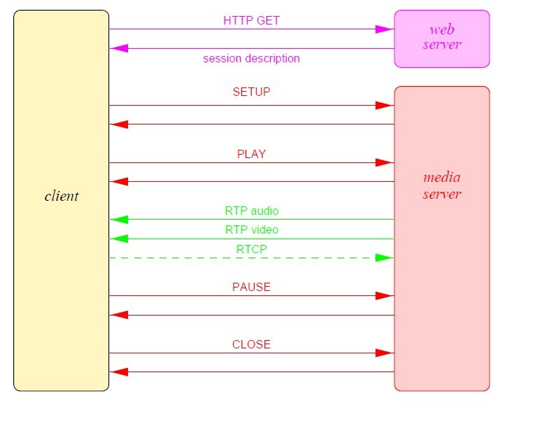 RTSP协议一般与RTP/RTCP和RSVP等底层协议一起协同工作,提供基于Internet的整套的流服务。它可以选择发送通道(例如:UDP、组播UDP和TCP)和基于RTP的发送机制。它可以应用于组播和点播。RTP, RTCP,RSVP 定义如下:
