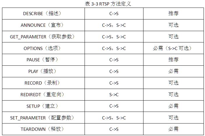 RTSP定义了OPTIONS、DESCRIBE、PLAY等命令方法用于服务器端与客户端的交互,为流媒体提供诸如播放、暂停、快进等远程控制功能,极大地丰富了流媒体的应用领域和实用范围。RTSP定义的方法如表3-3所示: