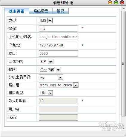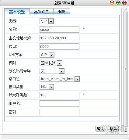 步骤三:配置与CCM对接的SIP中继。语音设置>>基本业务>>中继设置中添加一条SIP中继。中继信息中填写CCM的IP和端口,权限选择国际长途,路由组则选择另一个路由组from_cisco_to_ims,由于OfficeTen IPPBX与CCM是采用中继对接的方式,所以此处接口类型选择NNI,中继最大呼叫数默认为10,可按实际情况修改。
