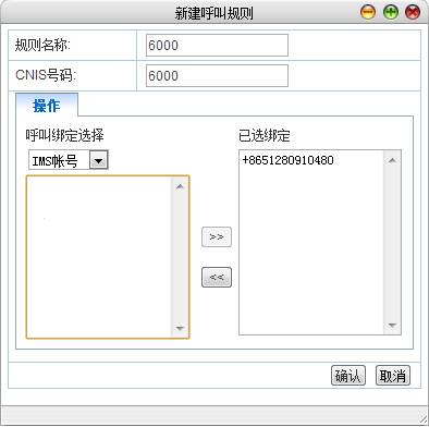 步骤四:配置主叫号码识别。语音配置>>基本业务>>主叫号码识别中,添加呼叫规则进行分机号和IMS帐号的绑定。如CNIS号码填CCM上的分机6000,呼叫绑定选择IMS帐号列表中的+8651280910480。同样,当有大量规则需要配置时,我们可以直接用Excel表导入。