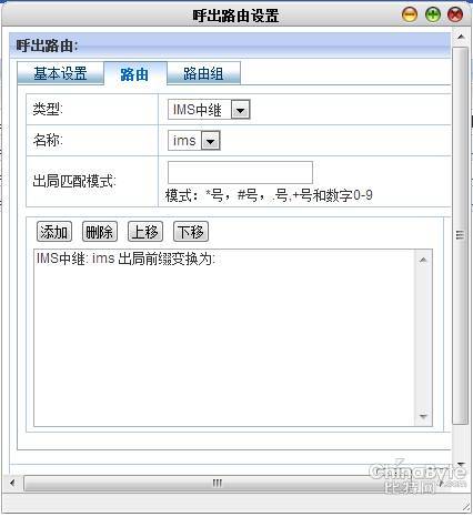 路由中由于出局时实际需要把前缀的0去掉,因此出局匹配模式为空,然后把IMS中继添加进去。